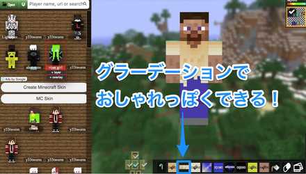 Web上で、マインクラフトスキンを作成できるツールを運営する海外サイト。 シンプルな作業環境とツールによって初心者でもマインクラフトスキンが簡単に作成できます。 MCSkinsTOPでのマイクラスキンの作り方はコチラ☆ 使用上の注意 オリジナルのスキンを設定しよう マイクラのスキンは専用のアプリを使って一から作ることもできます。 私はスキンを作れる自信がないので、プロの方(?)が作ったスキンがたくさんある以下のサイトからダウンロードしました。 なので私は自作ではないです^_^;
